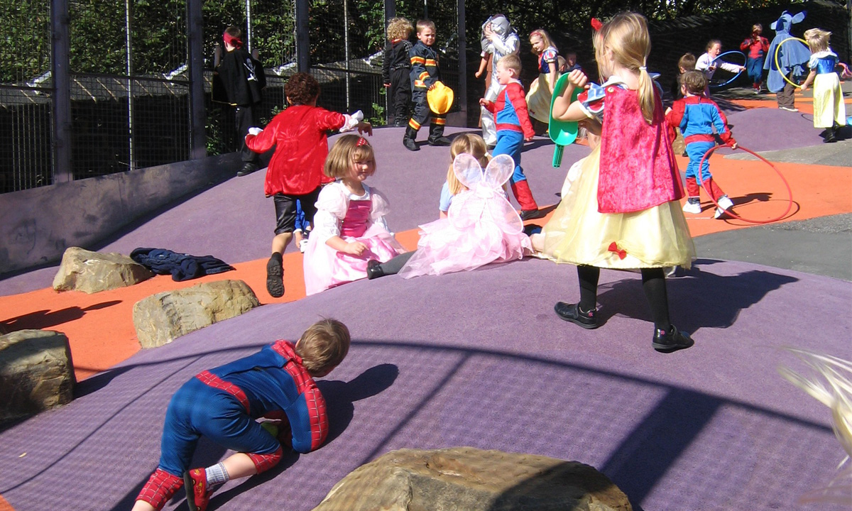• Volcanic purple mounds and orange lava streams in soft play surfacing to interrupt a long steep slope