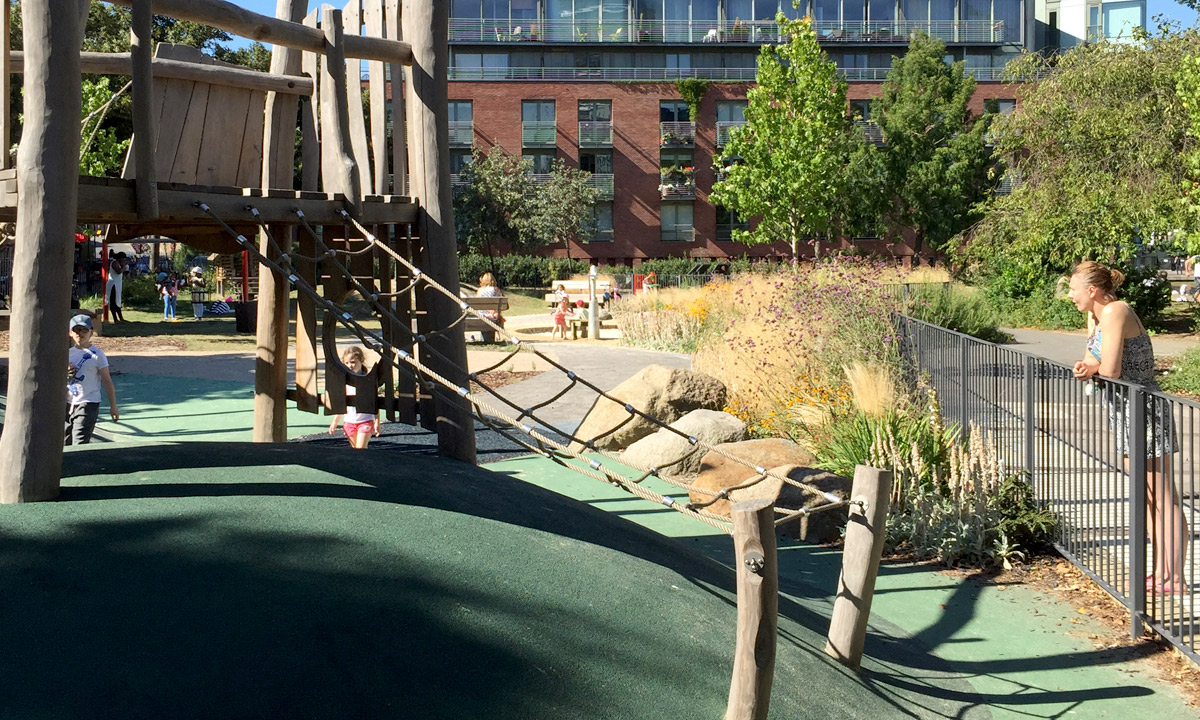 New play facilities loosely defined into toddler and older kids areas, including: Large sand pit with water pump and rill, embankment slide, swings, planting, seating, bespoke play unit with bridge and numerous climbing levels.