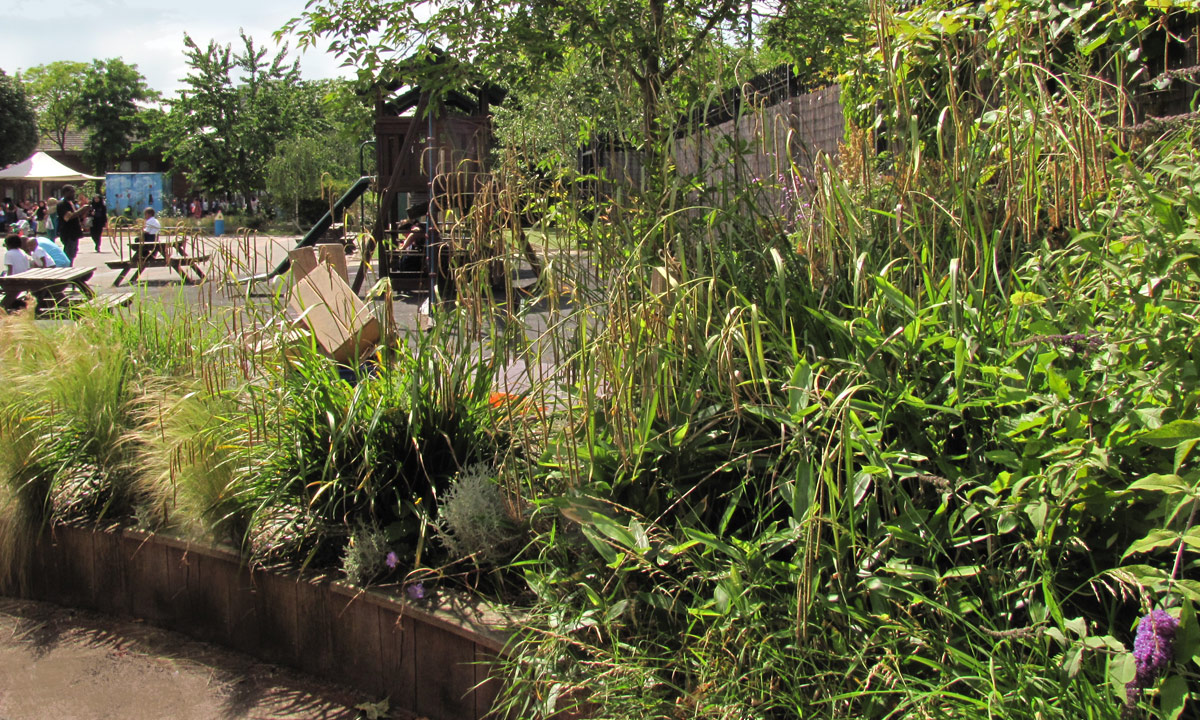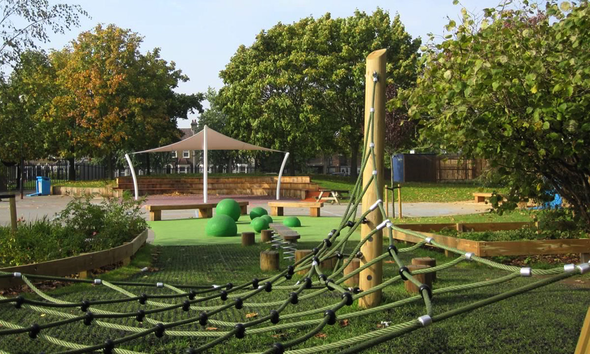 Features include: School Amphitheatre with tensile canopy, terracing to a failed sloping grass area, an extensive trim trial, inventive coloured ground markings, reception play area proposals including a bespoke sand pit and crane, a forest school and orchard area, school garden area, front entrance enhancements, KS1 Deck with canopy.